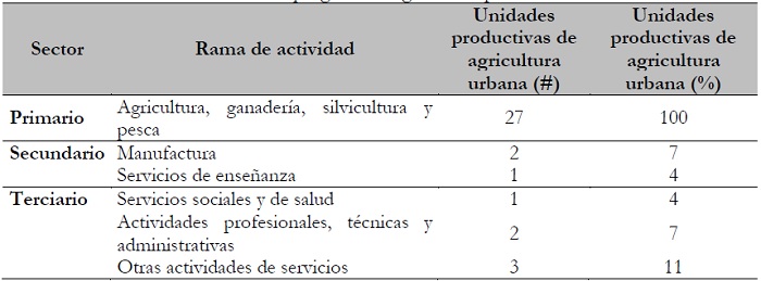 Dentro de las principales actividades productivas se destacan las pertenecientes al sector primario con el 100% de presencia en las unidades productivas de agricultura urbana evaluadas (tabla 2 y figuras 2a, 2b, 3a y 3b).