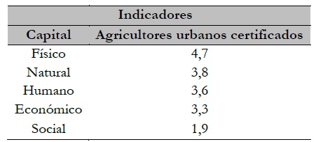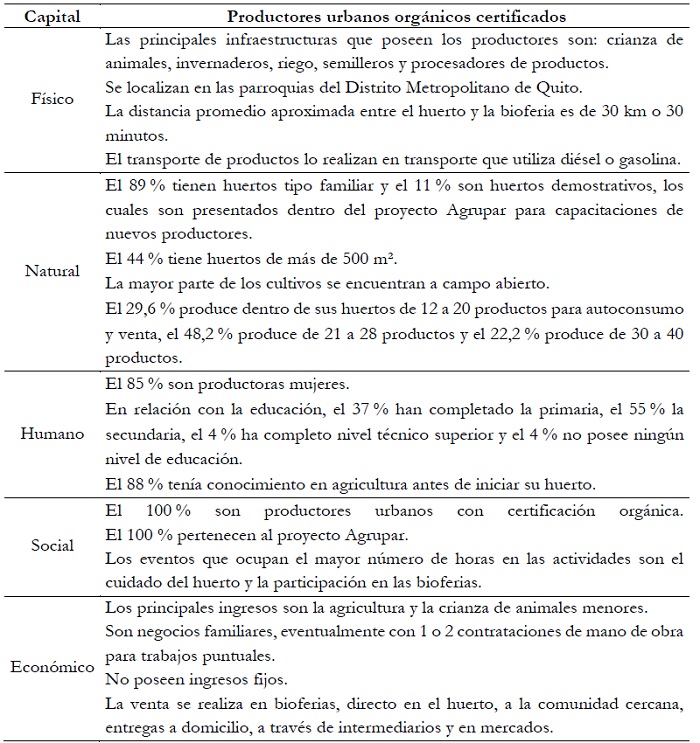 El segundo aspecto analizado corresponde a los capitales (tabla 3), factores que proporcionan elementos para identificar vulnerabilidades o puntales de desarrollo en cada ecosistema. Aquí, las unidades productivas de agricultura urbana se encuentran en la misma casa o en locaciones cercanas. Por otro lado, la producción es realizada principalmente por una persona adulta con eventuales ayudas de la familia o externas y, adicionalmente, dentro del uso del tiempo, los productores asisten a reuniones en asociaciones de productores y encuentros del proyecto Agrupar, entre otros.