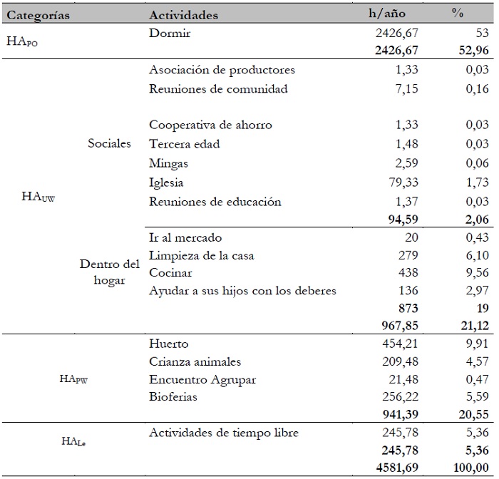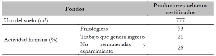 En resumen, en términos de uso del suelo, en promedio los agricultores urbanos que tienen certificación orgánica destinan 777 m.. En cuanto a las actividades fisiológicas, no remuneradas y de esparcimiento, se han considerado actividades de descanso, cotidianas, continuas y eventuales (79%). Finalmente, las actividades relacionadas con el proyecto Agrupar y la agricultura urbana se han agrupado en actividades remuneradas, el porcentaje promedio es de 21% e indica que cada día se destinan cerca de 300 minutos (tabla 6).
