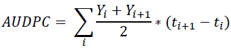 The AUDPC data from the three replicated experiments were analyzed by a Generalized Linear Model (GLM). The differences between the means were calculated by LSD Fisher’s test with Bonferroni correction. Additionally, using the disease index (DI), the phenotypic response of each genotype was characterized as resistant or susceptible based on Gorshkov and Tsers (2022); DI = 0 was established as resistant and DI > 0 as susceptible.