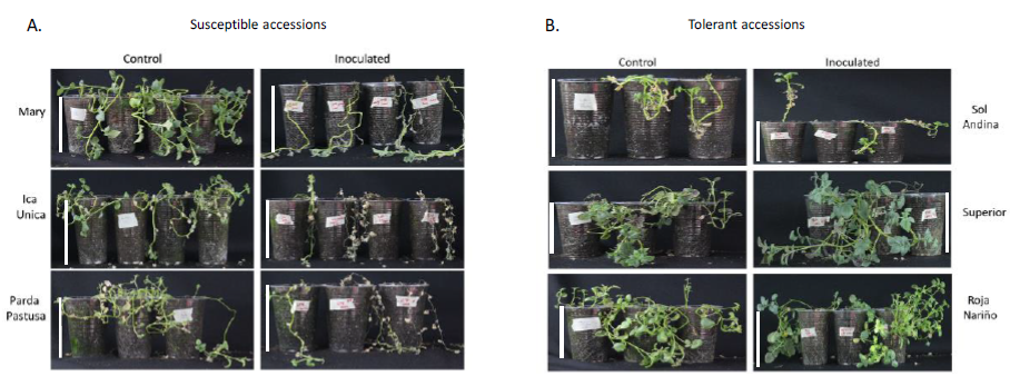 Figure 1. Phenotypic evaluation of potato germplasm for resistance against R. solanacearum. Symptoms are developed in three susceptible accessions: Mary, Ica Unica, and Parda Pastusa (A), compared to symptomless resistant accessions: Sol Andina, Superior, and Roja Nariño (B) at the end of the experiment, 25 days after inoculation. The vertical white line corresponds to 16 cm.