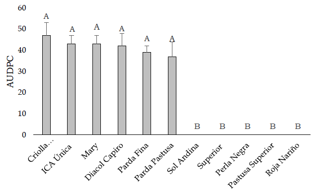 The aggressiveness of R. solanacaerum, calculated using the AUDPC, was evaluated in all accessions from the susceptible cultivars: the accessions of S. tuberosum group Phureja (Criolla Colombia) and S. tuberosum group Andigena (Diacol Capiro, Ica Unica, Mary, Parda Fina ,and Parda Pastusa) showed a similar degree of susceptibility against the R. solanacearum isolate (Figure 2).