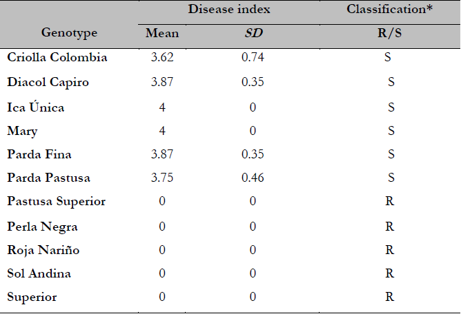 Table 1. Disease index (DI) and classification of each potato genotype evaluated as resistant (DI= 0) or susceptible (DI > 0)