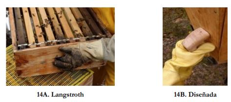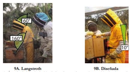 Figuras 8 Ángulo de la articulación del cuello durante una inspección de la cámara de cría (escala 1:1): 8A. colmena Langstroth y 8B. colmena diseñada