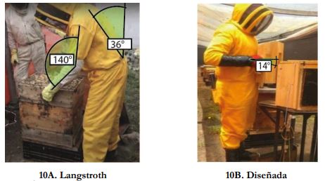 Al realizar la inspección en las colmenas tipo Langstroth en los apiarios, se observó que el apicultor estaba generando posiciones fuera de los ángulos de confort, principalmente en el cuello, la columna y la muñeca. Por ejemplo, durante la inspección de la colmena tipo Langstroth, el apicultor debe realizar una flexión de 71 ° (mayor al máximo de 45 °) (Croney, 1978) y en la colmena diseñada es de apenas 36 °. Para la columna se determinó que, aunque los ángulos de flexión no exceden los permitidos, el peso de la colmena Langstroth era superior en 100 % al permitido (Resolución 2400, 1979).