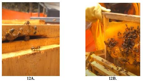 En las figuras 12a y 12b se muestra la piquera de la colmena, donde las abejas entran y salen, demostrando la aceptación por parte de estas hacia la colmena diseñada. También, se aprecia la colmena destapada con un cuadro de lado, en el cual se observan abejas y crías, dando a entender que la abeja reina se encuentra en correctas condiciones.