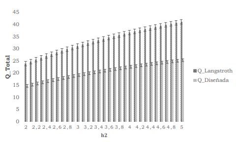 Con respecto a la figura 7 y los cálculos de la razón de transferencia de calor de los dos tipos de colmena, se encontró que la colmena diseñada requiere de menos energía para mantener una temperatura interna en la cámara de cría de 35 °C con respecto a la colmena Langstroth (figura 13), lo que implica que las abejas pueden reducir su esfuerzo físico para conseguir una temperatura de 35 °C y así gastar su energía en otros deberes como la recolección de polen, la puesta de larvas y la producción de miel. Además, el diseño de la colmena propuesta con las alzas melarias alrededor de la cámara de cría genera otras capas de aislamiento térmico que favorecen su confort térmico.