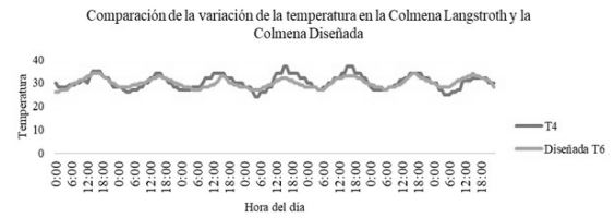 Por otro lado, se compararon las temperaturas registradas de las colmenas, Langstroth (T4) y la diseñada (T6), y se aprecia que el comportamiento de la temperatura de la cámara de cría de la colmena diseñada es más suavizado (saltos de 26 °C a 34 °C) con respecto al comportamiento de la colmena Langstroth (saltos de 24 °C a 37 °C) (figura 15), es decir que la colmena diseñada mantiene una temperatura más constante en el tiempo, lo que reduce el esfuerzo que tienen que hacer las abejas para mantener la regulación térmica dentro de la colmena.