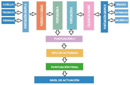 Para el desarrollo del método se utilizó la metodología presentada en la figura 2. En la figura 2 se establece un puntaje para los grupos A y B, seguido a esto se relacionan las valoraciones de fuerzas o cargas para el grupo A y la calidad de agarre para el grupo B, donde se obtiene un puntaje de esta relación y se establece si la actividad es repetitiva o no y, así, determinar qué acciones se deben tomar para mejorar la actividad.