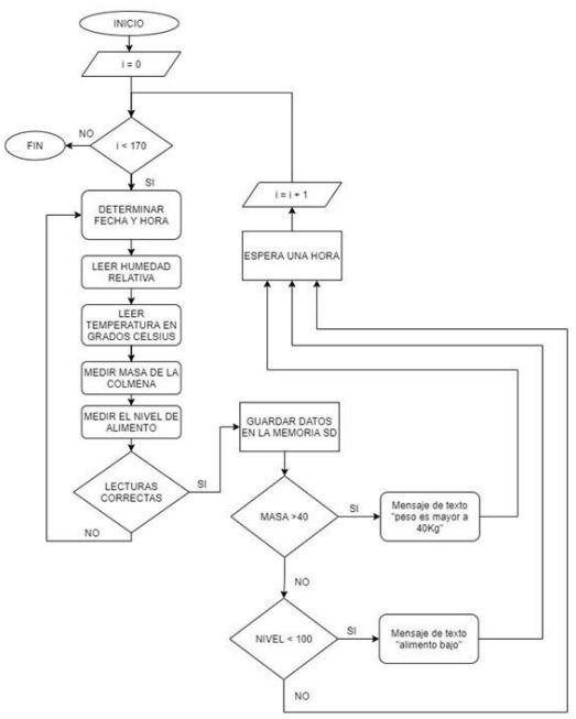 Para realizar la instrumentación de la colmena diseñada se midió su peso (18 kg), el cual no varía inicialmente, ya que las abejas no tienen una construcción en las alzas melarias ni han recolectado miel, pues la colmena lleva solo cuatro meses en campo y se considera que el crecimiento del panal se comienza a dar luego de cuatro o seis meses y luego de este tiempo se requieren otros cuatro o seis meses para la recolección de la miel (Garnica et al., 2006), así que en este momento se encuentran únicamente con crías y en fortalecimiento de la colmena, por lo cual, al contar con un sistema que da lecturas de cifras enteras, no es posible aún apreciar pequeñas variaciones en el peso de la colmena (variaciones entre 0-999 gr).