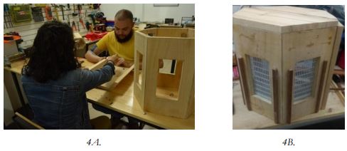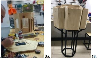Figuras 4 Desarrollo del prototipo de colmena diseñada (escala 1:1): 4A. manufactura de las partes de la colmena diseñada y 4B. cámara de cría de la colmena diseñada