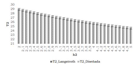Figura 7 Comparación de T2 en las dos colmenas con variación en h cada 0,1