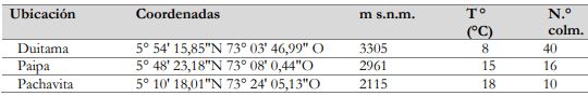 En esta investigación se trabajó con personal de la Corporación Tibairá, la cual cuenta con varios apiarios en el departamento de Boyacá, Colombia, de los cuales se visitaron y seleccionaron tres que están ubicados en los municipios de Duitama, Paipa y Pachavita, los cuales a su vez están localizados en tres pisos térmicos con diferentes condiciones de altura sobre el nivel del mar, temperatura, humedad relativa, flora, fauna y número de colmenas (tabla 1).