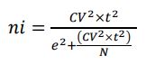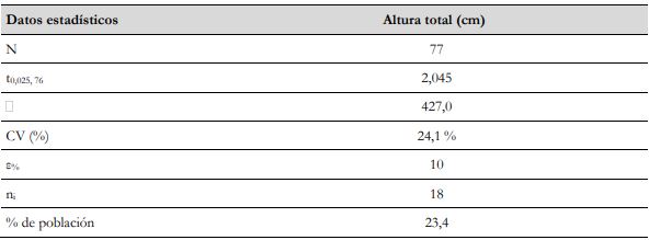 El CV % junto con el error máximo admisible de muestreo (ε %), correspondiente al 10 % en inventarios forestales (Da Cunha & Guimaraes, 2008), permitieron establecer el tamaño de la muestra (ni) a partir de la ecuación formulada por Yepes et al. (2011), cuando el inventario forestal se va a desarrollar sobre un mismo tipo de cobertura con base en un muestreo aleatorio simple (MAS), relacionándola en este caso con el cálculo del número de árboles para poblaciones finitas de la especie forrajera en estudio (ecuación 1) (tabla 3).