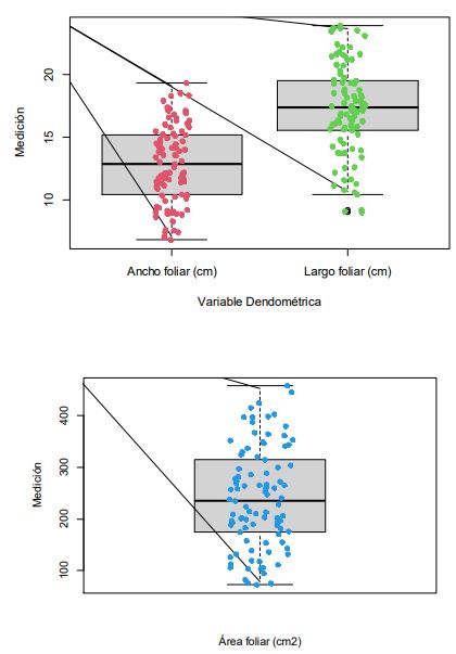El análisis estadístico se realizó desde la información de largo, ancho y AF por rama, fundamentado en estadística descriptiva e inferencial, donde la estadística descriptiva se abordó desde medidas descriptivas de tendencia central (media, mediana), posición (mínimo, máximo), dispersión (varianza, desviación estándar, CV, error estándar (EE)), normalidad (prueba de Shapiro-Wilk), gráficas descriptivas (diagrama de caja y probabilidad normal) y asociación (correlación r).