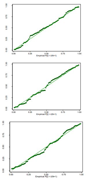 De la misma forma, la prueba de Breusch-Pagan señala homocedasticidad en los residuos (p > 0,05), es decir, la varianza del error o de perturbación es la misma sin importar el valor de X (largo o ancho foliar), o en otras palabras, las poblaciones Y (AF) tienen la misma varianza para los diversos valores de X (largo o ancho foliar), lo que se traduce en que la línea de regresión (la línea de la relación promedio entre X y Y) la variación es la misma para todos los valores de X, ya que no aumenta ni disminuye conforme varía X (Gujarati & Porter, 2010). De manera gráfica se presenta un patrón de residuos al azar y, por ende, una ausencia de tendencia (sesgo) en los residuos de los dos modelos exponenciales que presentan una correlación igual a cero (r = 0,0000), lo cual concuerda con lo señalado por Fox y Weisberg: