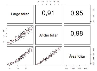 Las variables de largo y ancho foliar presentaron una correlación con la variable AF correspondiente a 0,954 y 0,979 (figura 4), respectivamente, lo que indica que el grado de asociación de cada variable con el AF es equivalente al 95,4 % y el 97,9 %, respectivamente (Szretter, 2013).