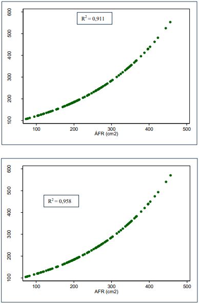 Así, los modelos exponenciales presentan una mejor estimación del AFE, tanto en LF (𝐴𝐹𝐸 = 28,0105𝑒0,1192𝐿𝐹) como en AnF (𝐴𝐹𝐸 = 35,2523𝑒0,1421𝐴𝑛𝐹), acorde con los criterios de bondad de ajuste, tales como el R2, al explicar la proporción de la variación total en la variable dependiente Y (AF) por las variaciones en la variable (única) explicativa X (largo o ancho foliar) (Gujarati & Porter, 2010), es decir, la variabilidad del AF estimada AFE es explicada en un 92,9 % y 94,1 % por las variaciones en el LF y el AnF, respectivamente (figuras 5).
