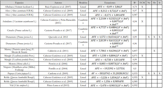 Asimismo, al seguir el modelo lineal simple se ha estimado el AF a partir del producto 𝐿𝐹 × 𝐴𝑛𝐹 (𝐴𝐹𝐸 = 𝛽𝑜 + 𝛽1𝐿𝐹 × 𝐴𝑛𝐹) en las especies de aliso (R2 = 0,97) (Cabezas-Gutiérrez et al., 2009), duraznero (R2 = 0,99) (Quevedo et al., 2012), mangle (R2 = 0,97) (Cabezas-Gutiérrez et al., 2009), mamey (R2 = 0,89) (Calderón et al., 2011), morera (R2 = 0,99) (Pentón et al., 2006), roble (R2 = 0,95) (Cabezas-Gutiérrez et al., 2009) y vid (R2 = 0,99) (Pérez-Luna et al., 2015) (tabla 9).