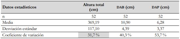 El tamaño de la muestra aleatoria se determinó al tener en cuenta la variabilidad de los datos del último muestreo para las variables: altura total (AT), diámetro del tallo a base (DAB) y diámetro del tallo a pecho (DAP), acorde con lo señalado por Segura y Andrade (2008), y se eligió la variable de menor variabilidad a partir del coeficiente de variación (CV), lo que corresponde a la AT de la especie (tabla 1). Posteriormente, se definió una muestra piloto de n = 30 para inventarios forestales, consignándose la información correspondiente a las medidas de tendencia central (media) y de dispersión (desviación estándar y CV) (tabla 2).