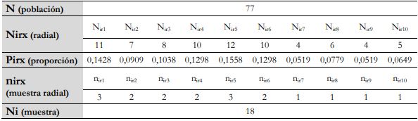 Posteriormente, se determinó el tamaño de la muestra por radial nirx (nir1, nir2… nir10) desde su proporcionalidad a partir de la ecuación 2, consignándose dicha información en la tabla 4.