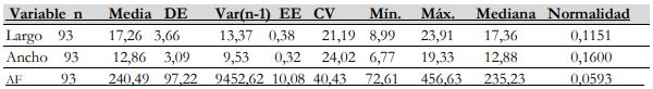 La estadística descriptiva estableció que la distribución de los datos de largo, ancho y AF presentaron una distribución normal soportada en la prueba de Shapiro-Wilk (tabla 5 y figuras 2) y el gráfico de probabilidad normal (figuras 3).
