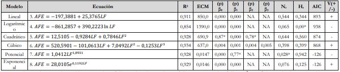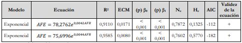 Lo anterior señala que el AFR explica la variabilidad del AFE basado en el LF en un 91,1 %, lo cual indica que el modelo exponencial 𝐴𝐹𝐸 = 78,2762𝑒0,0042𝐴𝐹𝑅 tiene un alto grado de confiabilidad. Asimismo, el AFR explica la variabilidad del AFE basado en el AnF en un 95,8 %, lo que muestra que el modelo exponencial 𝐴𝐹𝐸 = 75,6996𝑒0,0044𝐴𝐹𝑅 tiene un alto grado de confiabilidad.