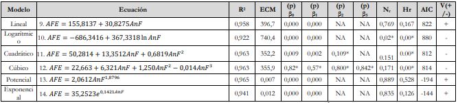 Las ecuaciones de regresión para el área foliar estimada (AFE), entre las variables área foliar real (AFR) vs. largo foliar (LF), soportadas en los criterios de bondad de ajuste, corresponden a los modelos lineal, cúbico y exponencial (ecuaciones 3, 6 y 8), descartándose los modelos logarítmico, cuadrático y potencial (ecuaciones 4, 5 y 7) (tabla 6). Las ecuaciones de regresión para la AFE entre las variables AFR vs. ancho foliar (AnF), basadas en los criterios de bondad de ajuste, competen a los modelos lineal, potencial y exponencial (ecuaciones 9, 13 y 14), excluyéndose los modelos logarítmico, cuadrático y cúbico (ecuaciones 10, 11 y 12) (tabla 7).