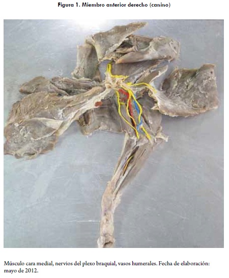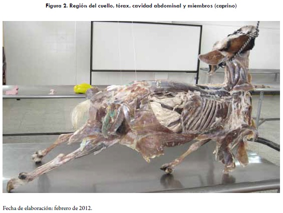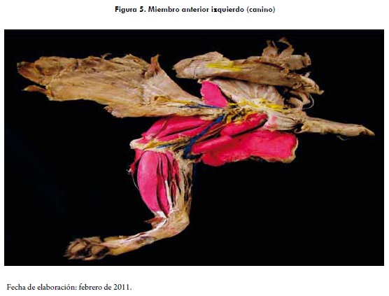 En el desarrollo del presente trabajo se han combinado diversas técnicas, para lo cual se realizó en primera instancia la aplicación por vía arterial (arteria carótida común) de una mezcla en partes iguales de formol (10 L) y de etanol (10 L) diluidos en agua (80 L), previo lavado del lecho capilar (heparina y agua). Las piezas se conservaron por espacio de siete días, tras lo cual se realizaron disecciones en diferentes capas. Durante este tiempo (cuatro semanas) se conservaron los cuerpos en recipientes con la misma mezcla. Posteriormente, se realizó la deshidratación con isopropanol, según lo recomendado por Jiménez e Isaza (7). A continuación, las piezas fueron sumergidas en glicerina (400 L) por un espacio de setenta días. En último término, los cuerpos se sacaron de la glicerina y se les realizó un proceso de curado por medio del aire circundante, evitando los rayos solares y la humedad por un periodo de treinta días. Algunas piezas fueron pintadas con óleo y pinturas acrílicas con el fin de resaltar las estructuras anatómicas más representativas. Algunas de las piezas obtenidas se pueden observar a continuación (figuras 1-5):