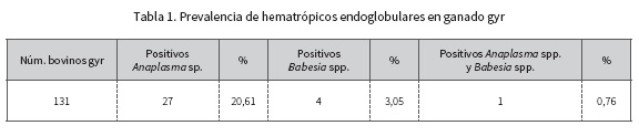 En el presente estudio, la población total de bovinos gyr puros muestreados de las cuatro explotaciones ganaderas evaluadas fue de 131 animales. Se encontró que el 24,43 % de los animales muestreados fue positivo a hematrópicos, de los cuales el 20,61 % (27/131) fue positivos a Anaplasma spp.; el 3,05 % (4/131), a Babesia spp.; el 0,76 % (1/131), a Anaplasma sp. y Babesia spp. conjuntamente (tabla 1).