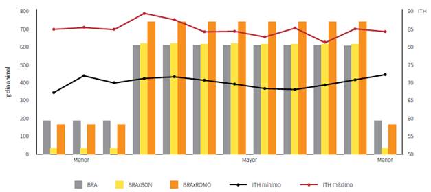 A diferencia de lo encontrado en este estudio, Cardozo et al. (16) encontraron mayor eficiencia productiva en animales B x BON en comparación al cruce B x Romo. Posiblemente esto se deba a diferencias en las condiciones de los agroecosistemas donde se realizaron ambos estudios (distribución y cantidad de lluvias, ITH, disponibilidad y calidad de forraje, etc.).