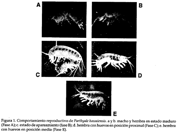 Durante el mes de marzo de 1990 en el área de Crespo y Marbella se colectaron organismos maduros en estado copulatorio y hembras ovadas del anfípodo P. hawaiensis. En el laboratorio, los individuos se ubicaron por parejas en beakers de 1000 mi con un volumen de 500 mi de agua de mar y aireación continua, observándose un total de 30 parejas. Se adicionó el alga U. lactuca v. rígida como alimento (además de sustrato) y nauplios de Artemia (1 nauplio/ml).