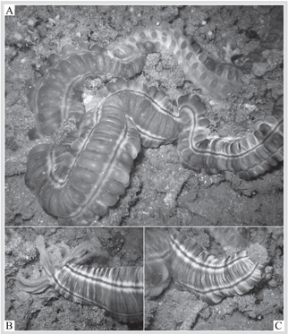 Figure 2 Euapta godeffroyi in its natural environment. A) Corn-like surface of the body wall. B) and C) Extended and hidden tentacles, respectively.