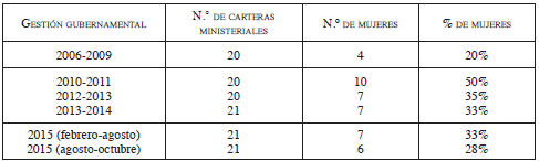 PRESENCIA DE MUJERES EN GABINETES MINISTERIALES EN EL PERIODO 2006-2015