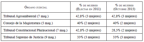 Según la Coordinadora de la Mujer, en el Órgano Judicial16, de 28 autoridades elegidas en las elecciones judiciales de 2011, 16 son hombres (57%) y 12 son mujeres (43%). El mayor porcentaje, en 2011, se concentraba en el Tribunal Constitucional Plurinacional (presidido por un hombre), con un 57%; le seguía el Tribunal Agroambiental (presidido por un hombre), con un 43%; muy cerca, el Consejo de la Magistratura, con un 40% (presidido por una mujer) y, finalmente, con un 33%, el Tribunal Supremo de Justicia (presidido por un hombre17)18. Para el año 2015 estos datos habían tenido muy pocas variaciones y tan solo el Tribunal Constitucional Plurinacional había modificado sus porcentajes por cambios sucedidos en el período.
