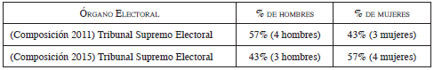 Fuente: Tribunal Supremo Electoral, 2010-2015; Coordinadora de la Mujer, 2015, y ACOBOL, 2015.