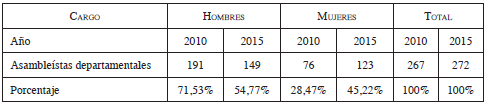 Los datos referidos a los gobiernos autónomos departamentales muestran la misma tendencia que los municipales; si bien tanto en las elecciones subnacionales de 2010 como en las de 2015 ninguna mujer fue elegida gobernadora21, la presencia de mujeres en las asambleas departamentales aumentó sustantivamente debido a la aplicación de la nueva legislación y a la vigilancia del movimiento de mujeres.