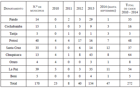 De manera concordante con estos datos, se ha generado un incremento sistemático de actos de acoso y violencia política, principalmente en municipios. Es así que desde el inicio de la gestión de las concejalas electas en el año 2010, fueron recepcionadas un total de 272 denuncias, registrando un 11% anterior a la promulgación de la Ley 243. Los mayores índices de denuncia se suscitaron desde la gestión 2012, con un 89%; los departamentos donde se produjeron más hechos de violencia son Chuquisaca, La Paz y Potosí, entre un total de 170 municipios que representan el 50% del total. La mayor cantidad de hechos de acoso y violencia política se dieron en la gestión 2013, considerando que las concejalas se encontraban a mitad de gestión; en primer término por presión para que renunciaran al cargo de concejala, y luego por una errónea e ilegal interpretación sobre la gestión compartida, según refleja el siguiente cuadro26.