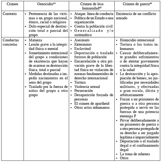 Como se puede evidenciar, en su mayoría, las conductas concretas que componen los crímenes internacionales son, a su vez, graves violaciones a los derechos humanos, salvo por algunas conductas de los crímenes de guerra. El elemento diferenciador es el contextual, porque no toda conducta concreta o grave violación a los derechos humanos se enmarca en los contextos requeridos por el Estatuto.