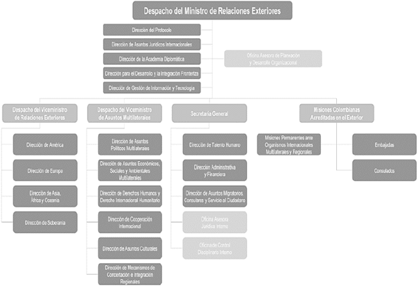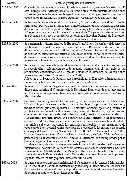 En cuanto a la estructura del ministerio, se debe señalar el constante cambio desde 1992, en total ha experimentado siete cambios considerables por medio de los decretos: 2126 de 1992. 1676 de 1997, 1295 de 2000, 2105 de 2001, 33555 de 2009 (modificado por el Decreto 2674 de 2013) y el cambio en su estructura más reciente fue por medio del Decreto 869 de 2016. Como resultado de estas sucesivas reestructuraciones se han creado y suprimido, más la segunda que la primera, direcciones, viceministerios y demás unidades, los cuales han incidido en el ejercicio de la política exterior colombiana (tabla 2).