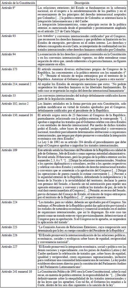 En la Constitución Política de Colombia, no se presenta una sección unificada y coherente sobre la política exterior, si bien, el capítulo VIII se denomina: "De las relaciones internacionales", los cuatro artículos, del 224 al 227, que lo componen son insuficientes para dar cuenta y reconstruir los elementos y características constitucionales de la política exterior colombiana. Es decir, estos aspectos se encuentran dispersos y en ocasiones inconexos a lo largo de la carta magna. Por lo tanto, a la hora de llevar a cabo un análisis de dicha constitución, en clave de política exterior, es necesario transitar por buena parte de ella, tanto en su parte dogmática, como en la orgánica, tal como se muestra a continuación (tabla 1).