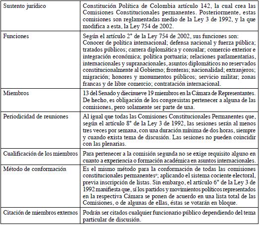 Adicionalmente, la Constitución determina en el artículo 142, que el Congreso elegirá comisiones de trabajo permanentes. Estas comisiones están determinadas por la Ley 3 de 1992 y la Ley 754 de 2002, y se dividen en siete comisiones, siendo la segunda, en Senado y Cámara, la encargada de los asuntos exteriores, la cual será detallada más adelante.