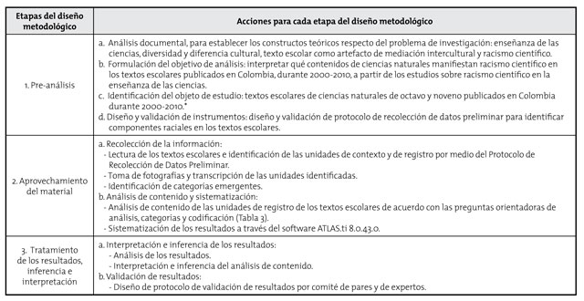 Con el propósito de analizar qué contenidos de ciencias naturales pueden ser interpretados como racismo científico, en los textos escolares publicados en Colombia, durante 2000-2010, se siguió una metodologia de tipo cualitativo interpretativo de acuerdo con lo planteado por Vasilachis (2006) y Rodríguez y Valldeoriola (2009), y un diseño metodológico basado en el análisis del contenido, propuesto por Bardin (1977), Krippendorff (1980) y Aigenere (1999). El diseño metodológico se describe en la Tabla 1.