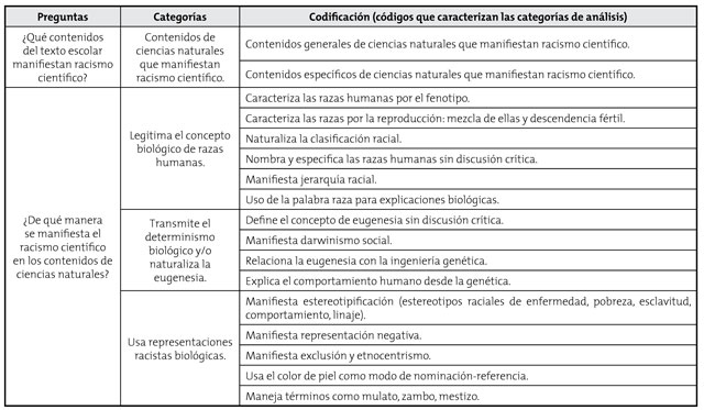 En este sentido, al revisar los antecedentes en el contexto colombiano, se encuentra que, aunque se han realizado diversos estudios sobre racismo en textos escolares de Ciencias Sociales (Herrera, Pinilla y Suaza, 2003; Mena, 2006; Soler, 2006, 2008, 2009; Aman, 2010; Almeida y Ramírez, 2010; Yáñez, 2010; Cerón, 2011, 2012; Vargas, 2017) y de Historia (Mena, 2009), entre otros, en la literatura revisada no se han reportado estudios sobre el racismo en los textos escolares de ciencias naturales, ni tampoco estudios que aborden la relación de la enseñanza de las ciencias y el racismo científico en los textos escolares colombianos. De este modo, en esta investigación se realizó un análisis que permitiera identificar qué contenidos de los textos escolares de ciencias naturales publicados en Colombia durante los años 2000 al 2010 manifiestan racismo científico.