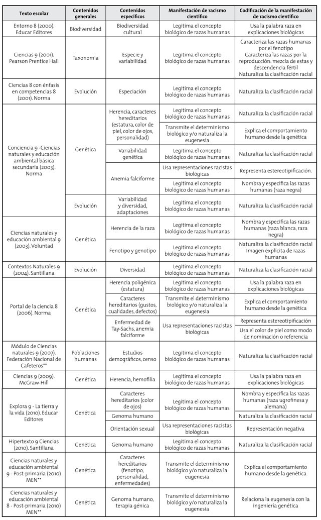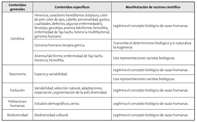 Los contenidos específicos de los textos escolares de ciencias naturales publicados en Colombia durante 2000 y 2010 que manifiestan racismo científico son los relacionados con la herencia, los caracteres hereditarios, enfermedades como la hemofilia y la anemia falciforme, el genoma humano, la especie y variabilidad, la selección natural, las adaptaciones, la biodiversidad cultural y los estudios demográficos. Estas mismas temáticas pueden ser la oportunidad para deconstruir el racismo científico y aclarar que, desde el punto de vista biológico y de la genética de poblaciones, no es posible agrupar a los seres humanos en razas, como se consideró en siglos anteriores, y mucho menos etiquetas de comportamiento o de jerarquía de habilidades. Ese proceso de deconstrucción del racismo científico debe ser un compromiso de la escuela y de la enseñanza de las ciencias, con el propósito de contribuir a una sociedad más equitativa que elimine cualquier proceso de discriminación y exclusión.
