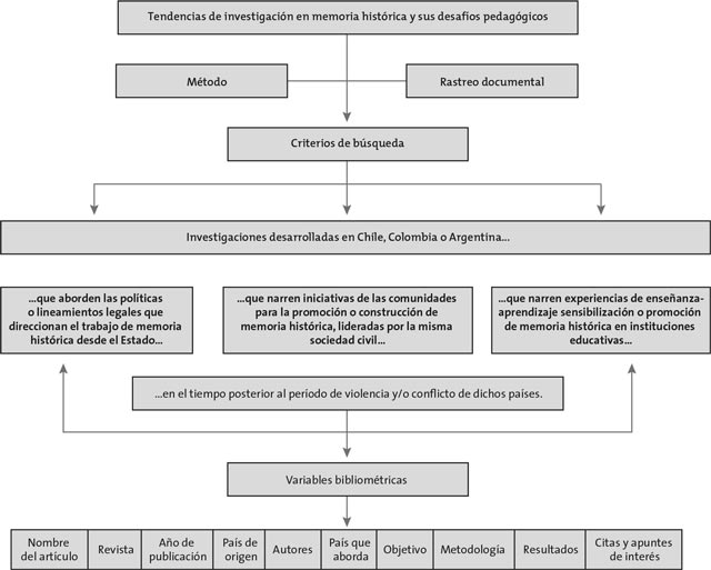 Precisamente, es el tratamiento de la memoria histórica de estos periodos de violencia, resultantes de los conflictos internos, el que rastreamos en este trabajo. Tomaremos, entonces, los casos de las dictaduras de Argentina y Chile y el caso de Colombia. En este orden de ideas, el criterio de búsqueda fue construido con el objetivo de conocer cómo interviene el Estado en una etapa posterior a la violencia y a través de qué medios garantiza el no olvido de las víctimas y las problemáticas. Propiamente buscamos investigaciones que abordaran las políticas o lineamientos legales y que, a su vez, orientaran el trabajo de memoria histórica desde el Estado, en el tiempo posterior al periodo de violencia y/o conflicto de dichos países.