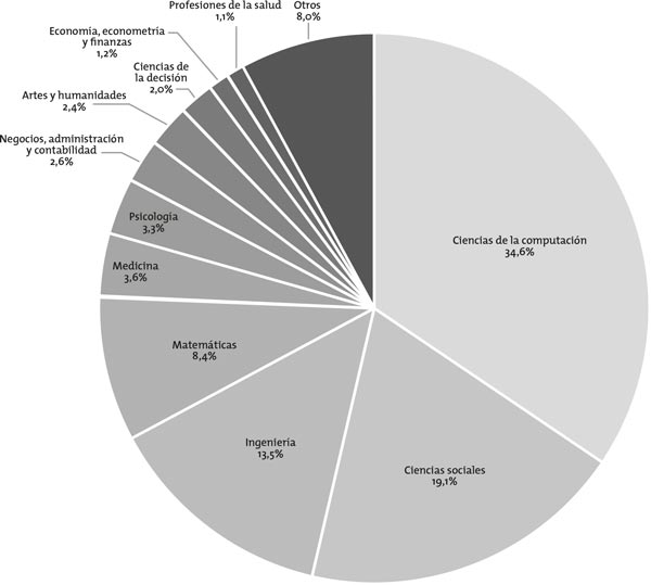 En cuanto a la procedencia de las publicaciones realizadas en dichos temas, se pudo determinar que la mayor parte de los documentos publicados sobre dichos temas proceden de Estados Unidos (22,5%), Reino Unido (7,9%), China (4,9%), Alemania (4,6%), Canadá (3,9%) y España (4,1%), principalmente. Además, en la Figura 3 se muestran las principales áreas del conocimiento en las cuales se han realizado dichas publicaciones. Se puede observar que las ciencias de la computación es el área donde los juegos tienen su mayor impacto, explicado en gran medida por el auge de los videojuegos y de las tecnologías de la información y la comunicación, seguidos por ciencias sociales, ingeniería, matemáticas y medicina.