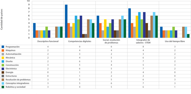 Adicional al análisis centrado en los enfoques, se presta atención a algunas temáticas que trabajan diversos países (Tabla 2). Es de notar que la mayoría de las naciones registradas en el estudio dan un alto grado de importancia a todo lo concerniente a lógica de programación y uso de lenguajes computacionales (89%), seguido, con un 67%, de: conceptos integradores, que hacen alusión al uso de otras asignaturas y su respectiva relación entre sí; robótica y sociedad (en lo social, histórico, ético y lo relativo a la ciudadanía y la legislación); y automatización, que integra sistemas de control para el manejo y desarrollo de elementos autónomos. Cabe destacar que la automatización presenta substancialmente conceptos mecánicos, electrónicos, uso de energías, máquinas, diseño, construcción, entre otros, los cuales también se encuentran en la Tabla 2, pero con menor porcentaje; así mismo, la mitad de los países integrados en el estudio tratan de establecer una relación directa entre la robótica y la resolución de problemas como método de aprendizaje.