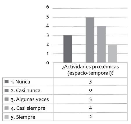 En relación con las actividades académicas desarrolladas para la evaluación de la persona ciega, los docentes afirman, en su mayoría, que aplican instrumentos de evaluación auditivos; "casi siempre" y "siempre" se apoyan en actividades de estimulación táctil; "algunas veces" realizan actividades de motricidad fina; la mayoría de los docentes indican que "nunca" realizan actividades de motricidad gruesa; "algunas veces" aplican actividades proxémicas; "nunca" y "casi nunca" efectúan actividades cinestésicas y kinestésicas.