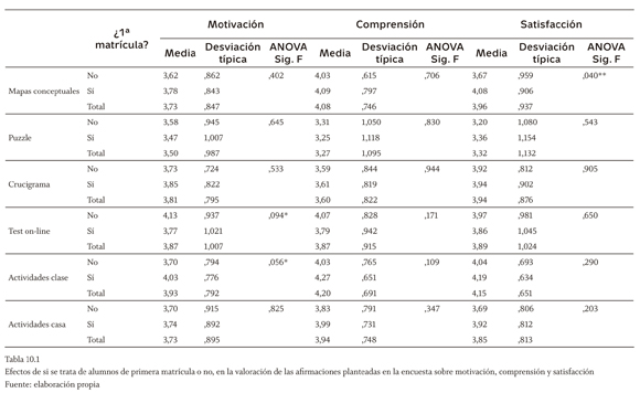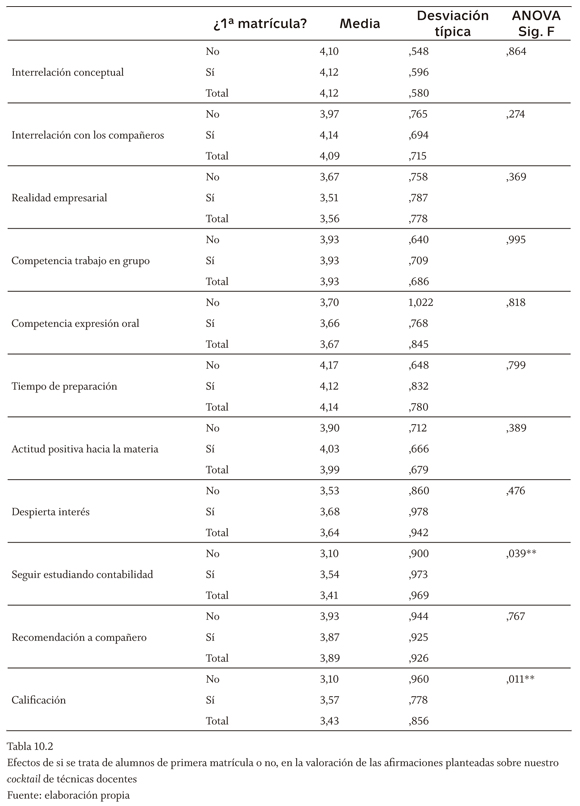 El hecho de que sea la primera vez que el alumno se matricula en esta asignatura (tabla 10.1), no sirve para explicar el nivel de acuerdo con las afirmaciones planteadas en la encuesta sobre motivación, comprensión y satisfacción pues de nuevo no hay diferencias significativas, salvo para la satisfacción que produce la utilización del mapa conceptual (significativo al 5%), mayor en los alumnos no repetidores. Al 10% de significatividad, este factor es explicativo de la motivación que producen las actividades en clase (también superior para los nos repetidores) y la motivación del test on-line (que en este caso se valora mejor por los alumnos repetidores, probablemente por estar conscientes de que en convocatorias pasadas en el examen de la asignatura aparecieron preguntas de este tipo y la realización de las mismas los incentivaba a venir a clase para practicar sobre esta técnica concreta). Por otro lado, la tabla 10.2 pone de manifiesto que al 5% de significatividad, el hecho de que el estudiante estudie la asignatura por primera vez, sí explica su interés por seguir estudiando contabilidad en mayor medida que si ya ha estado matriculado en la asignatura otro/s cursos (esto puede indicar que anteriores fracasos en la asignatura hacen que el alumno haya desarrollado una actitud negativa hacia la contabilidad en general) o que considere que debería otorgársele mayor peso a la realización de estas técnicas en la calificación final.